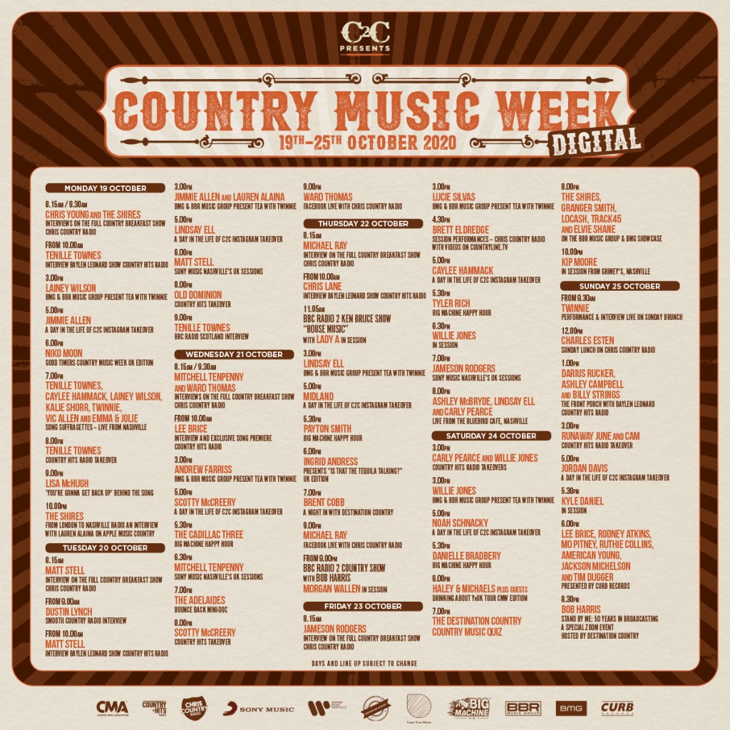 From Monday 19th – Sun 25th October 2020 you can virtually embrace the spirit of Country music week with events ranging from a live-streams from Nashville (from artists like my favourite Mo Pitney and Judi’s fave Kip Moore) to a Saturday night Country Music Quiz.