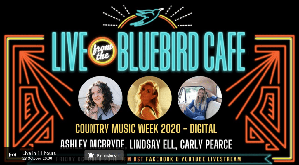 FRIDAY 8PM: Ashley McBryde, Lindsay Ell & Carly Pearce live from Nashville’s Bluebird Café. Having previously flown across the Atlantic and queued for 4 hours just to get into the last two songs of a Bluebird café show, I’m not missing this chance to have the in my living room. Watch Via Bluebird’s Youtube channel.